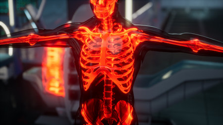 3d rendering of x-ray human skeleton with glowing particles on dark background