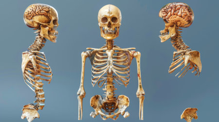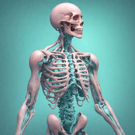 A vibrant 3D rendering of the human skeleton, showcasing its structure and interconnections, ideal for educational purposes in anatomy and physiology.