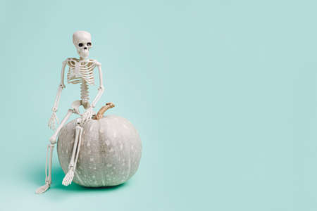 Human skeleton sitting on the fall gourde fresh pumpkin against pastel green background. Creative Halloween concept. Minimal horror wallpaper. 31th October party invitation card with copy space.