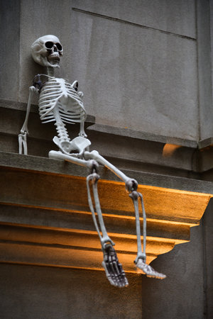 Scary spooky skeletons outside the of building for Halloween celebration.