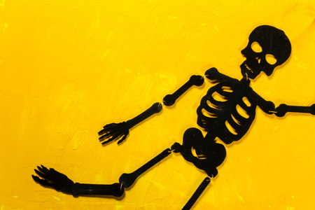 Skeleton on stairs, yellow background. Concept art, minimalism