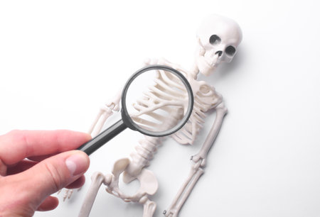 Hand with a magnifying glass examines toy skeleton