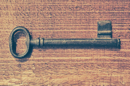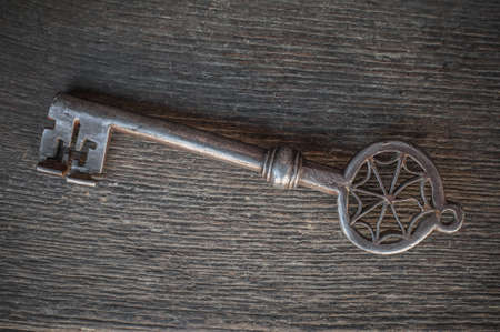 Closeup detail view of old large huge massive metal key for entrance the church. Secret and mystery. Medieval security and safety
