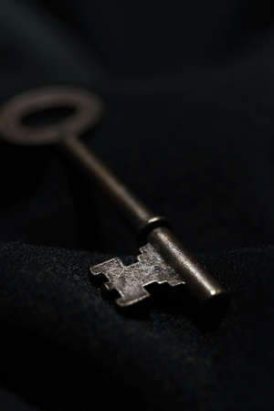 Three old keys on dark plates close up. Objects on a black background. Concept photo
