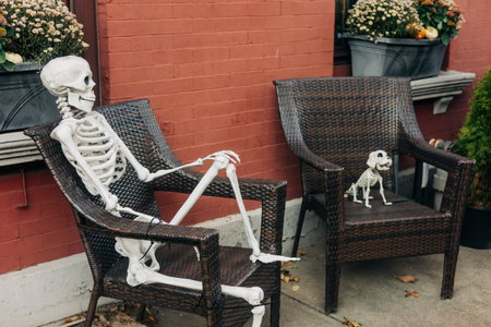 Halloween decoration near cafe or restaurant, modern skeletons sitting, talking, using mobile phones, having fun like people outdoor.