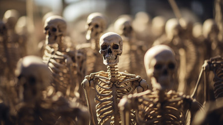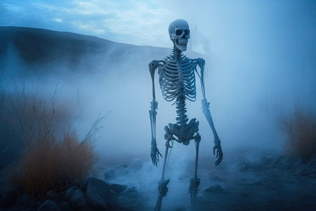 Mysterious skeletons in thick fog creating eerie atmosphere and haunting scene. concept of halloween decor, spooky mood, chilling ambience.
