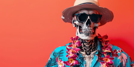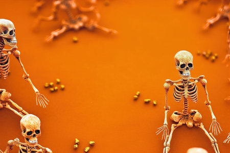 Halloween holiday concept. Skeleton on orange background with copy space. AI generative