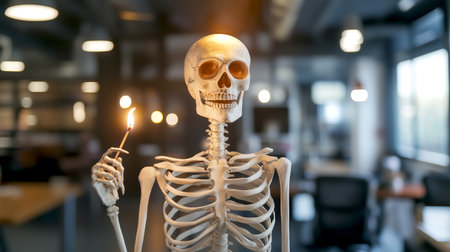 Skeleton holding matchstick in modern office setting. Emotional burnout at work concept
