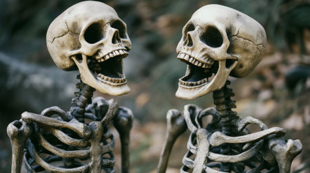 Funny skeletons share a laugh during a lively Halloween gathering in a spooky forest setting at twilight