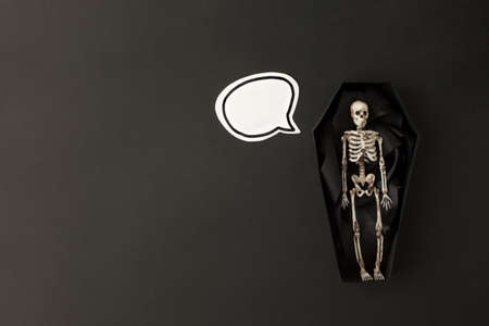 Happy Halloween holiday concept. Decorative skeleton of man in paper handmade coffin on black background. Halloween party greeting card, invitation, banner, copy space