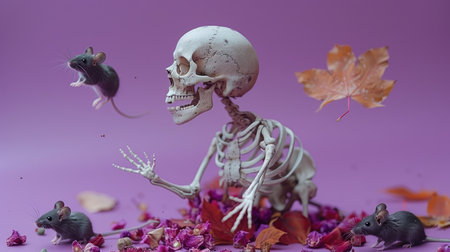 Skeleton with Mice and Autumn Leaves on Purple Background Eerie Halloween and Fall Concept Art