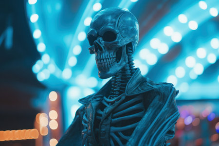 Neon carnival skeleton costume. Satanic holiday. Generate AI