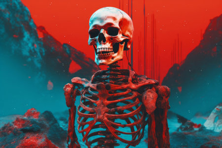 Skeleton body on red macabre sky. Bones corps on infernal nighttime backdrop. Generate ai