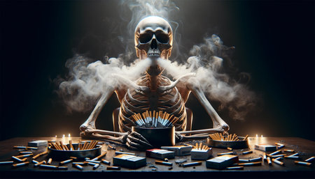 Human skeleton sitting at a wooden table. The skeleton has several cigarettes clenched between its teeth, the smoke billowing upward. The table is littered with ashtrays filled with cigarette butts and packs of cigarettes.