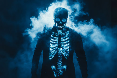Skeleton figure emerging from smoky background, glowing with blue light, representing Halloween, death, and fear concepts