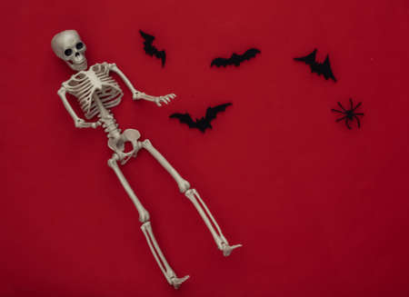 Halloween holiday concept. Skeleton and flying bats, spiders on a red background