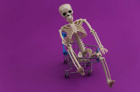 Halloween scary theme. Skeleton and shopping trolley on purple background.