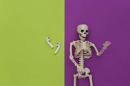Skeleton and wireless headphones on green purple background. top view
