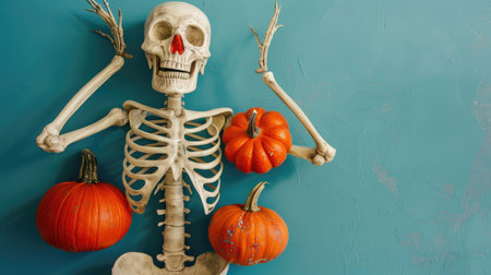 Funny skeleton character posing with pumpkins, Adding a playful touch to the Halloween background. Ai Generated