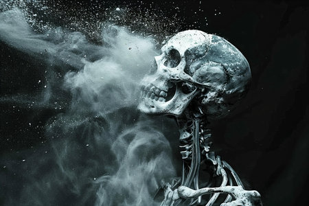 A haunting skeleton sits amidst a thick fog, creating an eerie atmosphere perfect for Halloween or horror themes. The dark and mysterious setting emphasizes the skeletal structure, evoking feelings of intrigue and fear.