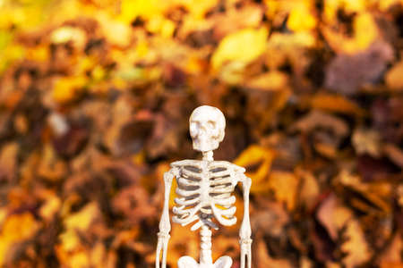 Small human skeleton among yellow autumn leaves close up