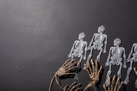 Multiple skeleton toys and skeleton hands with copy space on grey background. halloween festivity and celebration concept