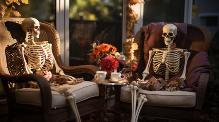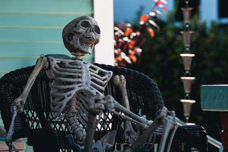 Skeleton in a home chair for the terrace. Halloween scenery on the porch of the house. October decoration outside.