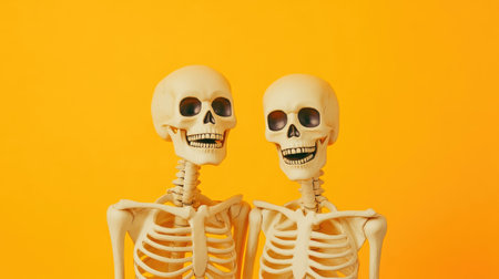 Two fake skeletons on yellow background. Halloween decoration, scary theme. flat lay
