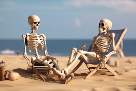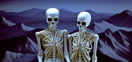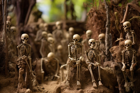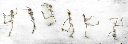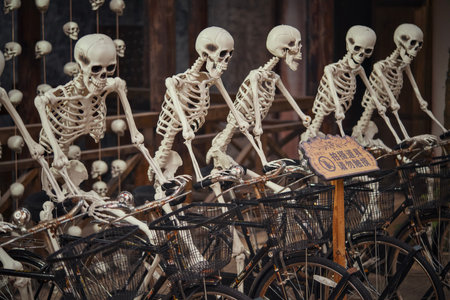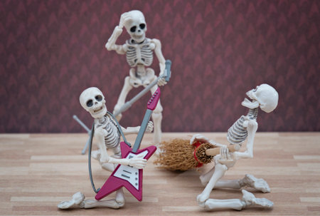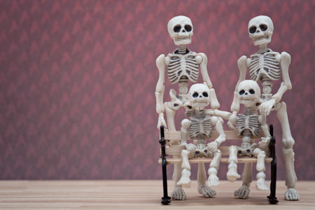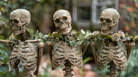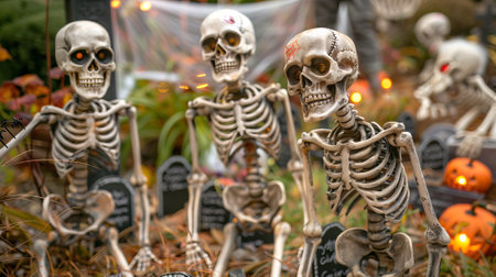 Group of skeletons in humorous poses arranged in a Halloween setting. Concept of Halloween decorations, spooky fun, festive atmosphere, humorous display.
