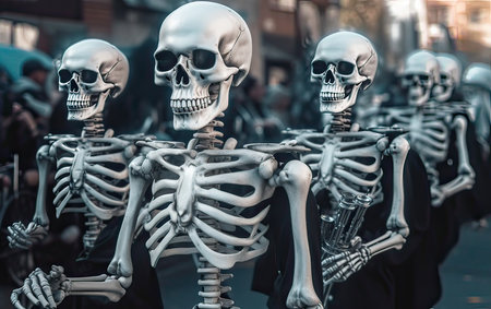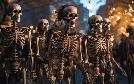 Skulls, Skeletons, Night Street Parade, Halloween, Spooky Atmosphere, Dark Alley, Mysterious Event.