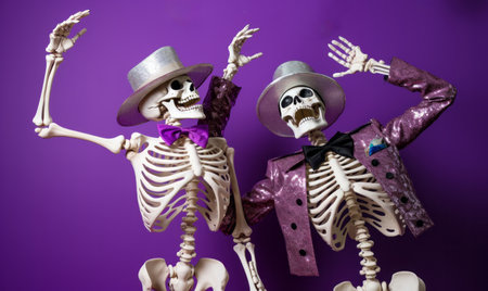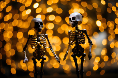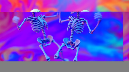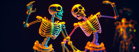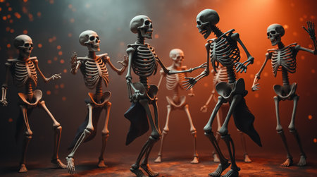 A group of playful skeletons is dancing together under warm, colorful lights, creating a festive and eerie atmosphere perfect for Halloween celebrations.