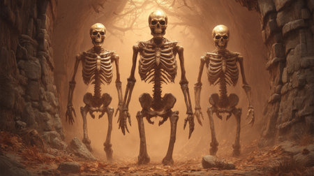 Three human skeletons stand eerily in an enchanted forest, surrounded by fallen leaves and bathed in ominous lighting, evoking a sense of mystery and adventure.