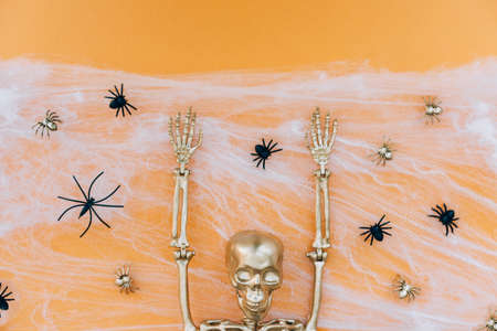 Funny halloween background with cobweb, spiders and golden skeleton over orange background with copy space. Halloween party celebration concept