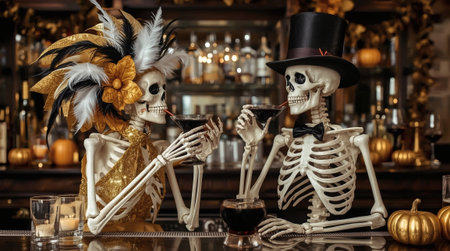 A couple of skeleton lovers with cocktails at the bar. A party in honor of Halloween or the Day of the Dead.