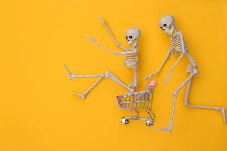 Shopping trolley with funny skeletons on yellow background. Halloween theme. top view