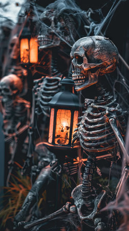 Halloween skeleton figures holding lanterns surrounded by spider webs and autumn leaves. Concept of spooky decoration, horror, autumn festivity, and Halloween night.