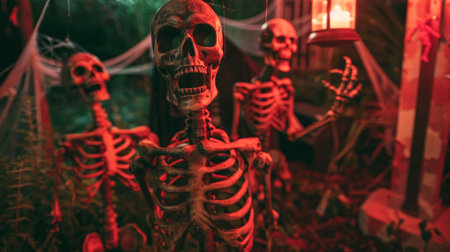 This captivating Halloween scene features hanging skeletons draped in cobwebs, creating a spooky atmosphere perfect for festive gatherings.