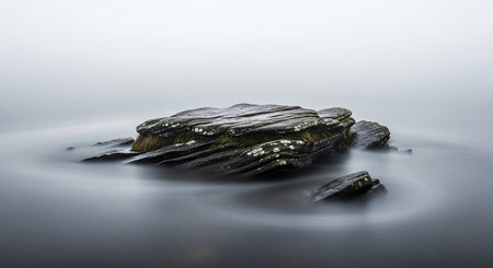 A dark, layered rock formation with patches of moss and white lichen emerges from still, misty water creating subtle circular ripples.
