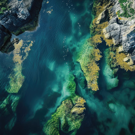 Coastal cliffs and shorelines, highlighting the intricate patterns created by waves and rock