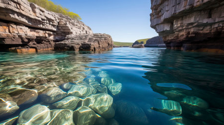 The clear turquoise waters shimmer in the sunlight, nestled between dramatic rocky cliffs, showcasing the beauty of nature's coastal formations.