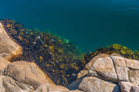 Colorful rock formation around picturesque small town Gudhjem in Bornholm, Denmark