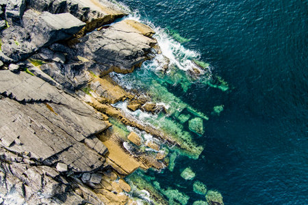 Aerial view of rough and rocky shore along famous Ring of Kerry route. Rugged coast of on Iveragh Peninsula, County Kerry, Ireland.