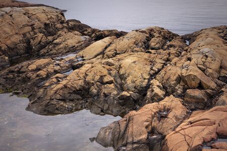 Close up of orange rock formations on norwegian beach, calm water. Nesodden peninsula, Norway.