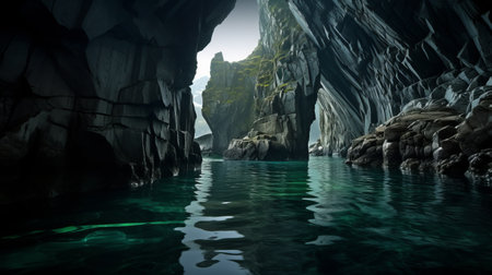 a man gazes at a mesmerizing cave nestled in the emerald waters, showcasing a stunning blend of gray and green hues. this terragen-style photograph captures the beauty of nature with vray tracing, evoking a sense of nostalgia. a creased texture adds depth to this national geographic-worthy image. ai generated