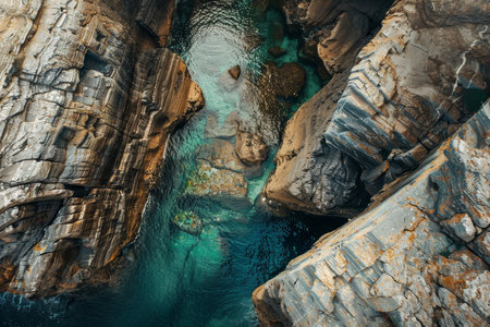 A stunning aerial view of a cliff by the ocean, where the fluid water meets the natural landscape, creating a picturesque and tranquil scene under the open sky AIG50