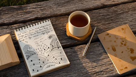 An overhead shot captures an open notebook, several pencils, and a dark cup of coffee arranged on a rustic wooden surface, bathed in natural light.