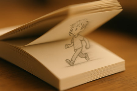 A captivating close-up of an open flipbook on a warm wooden surface, revealing a charming hand-drawn animation of a cartoon boy walking across its pages. The image beautifully captures the essence of traditional animation, creativity, and the simple magic of bringing drawings to life through sequential art.