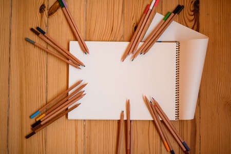 Top view of graphics tablet and stylus near open notebook and color pencils on yellow surface