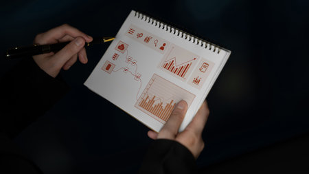 A vibrant and creative illustration of hand-drawn graphs and arrows on a notebook, showcasing financial analysis and business growth concepts in a warm workspace.
