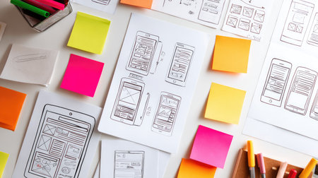 This image showcases a vibrant workspace filled with wireframe sketches and colorful sticky notes, representing the creative process of designing user interfaces. Ideal for design projects.